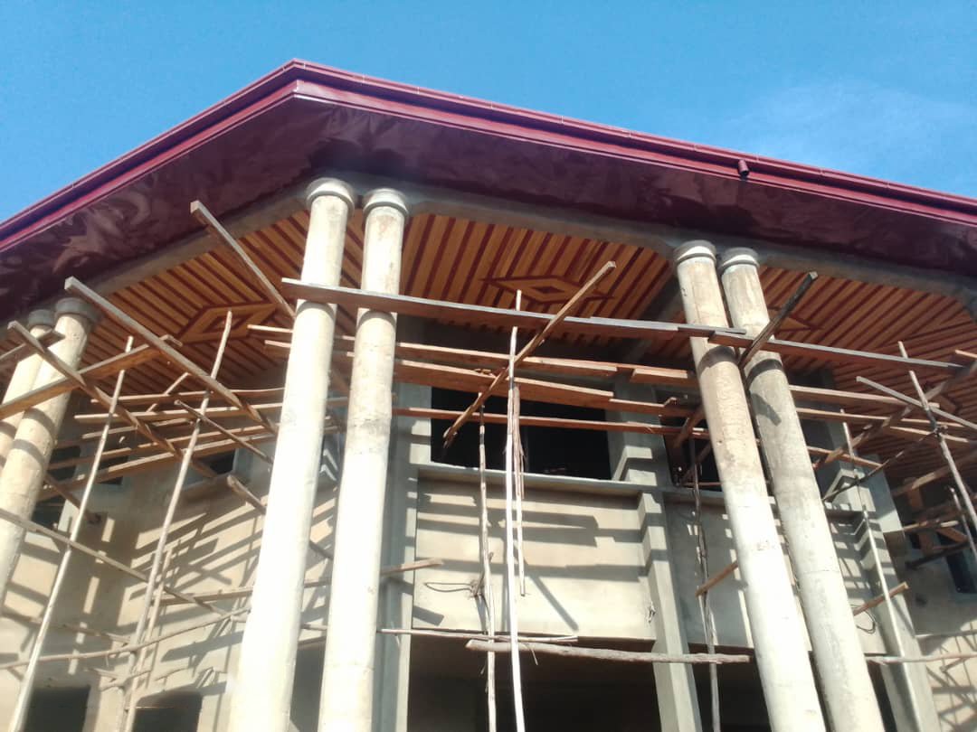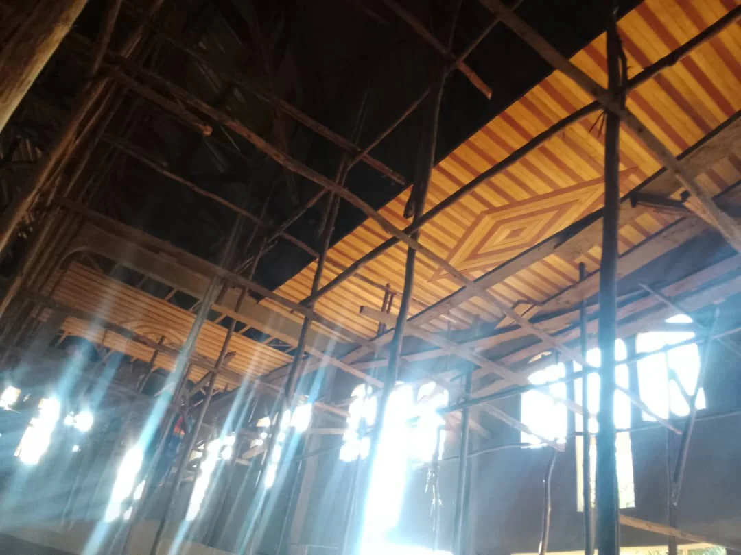 The ceiling material is called Lambri. It is very hard wood that has been treated for durability and will last for many years. It is a versatile cladding technique used in building construction to cover walls and ceilings, providing both aesthetic, protective, and functional benefits. The alignment depends on the carpenter's expertise. The carpenter, Mr. Yufenyuy Bertrand, and his co-workers are doing a great job.